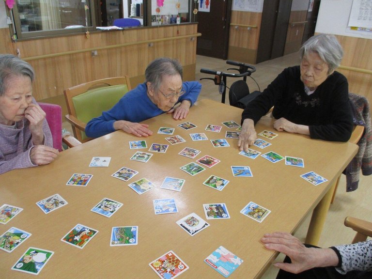 楽しそうなかるたの絵とは反対に真剣な表情の入居者様でした、、、。