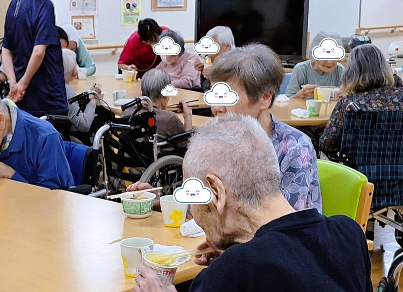 あさがお・ひまわりユニットのおやつはミニカップ麺です。たくさんの種類の中からお好みの味を選んで召し上がっていただきました。初めてカップ麵を食される方がいて気に入ってもらえるか心配しましたが「美味しいね」と喜んでもらえました(^o^)/ヤッター