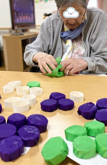 リハビリレクにて「ぶどう」を制作中~。完成が楽しみです🍇ちなみにシャインマスカットは広島生まれで【ぶどうの女王】とも呼ばれているそうです(豆知識)