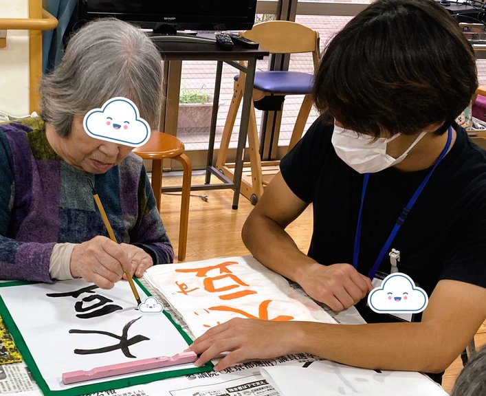 本日は書道サークルです。その様子を写真に収めていたら見慣れない作品がありました。「どなただろう?」と考えていたら正体は学生さんでした。久しぶりに墨の香りを嗅いだら書きたくなってしまったようです(わかります、その気持ちw) その後は入居の方々のサポートを積極的に行ってくれました。ありがとうございました。