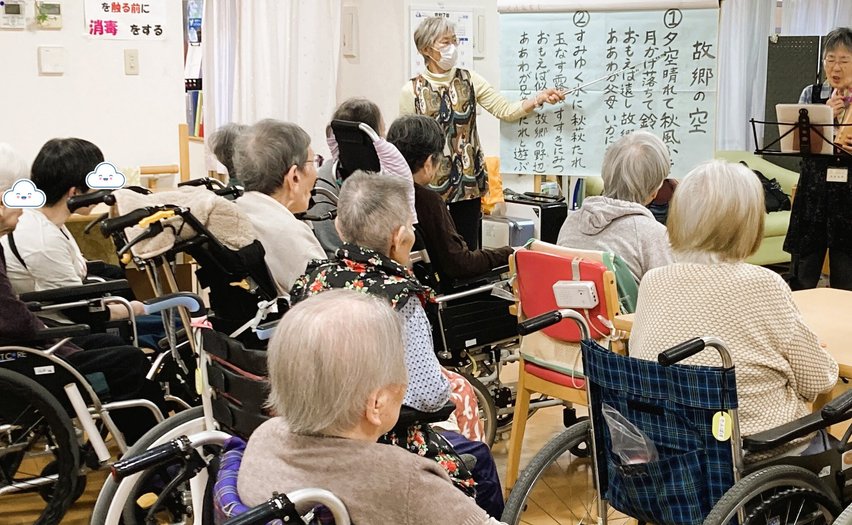 本日、あさがお・ひまわりユニットと、たんぽぽ・ひなぎくユニットに歌と演奏のサネカズラさんが来訪され、皆さま楽しそうに歌っていました。