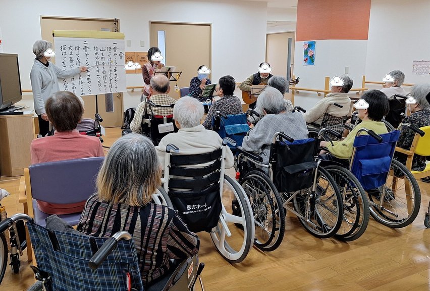 すいせん・たんぽぽユニットに歌う会のサネカズラさんが来訪され、サネカズラさんの生演奏に合わせて合唱しました。とくに皆様「おかあさんの歌」には気持ちをこめて歌ってらっしゃいました。