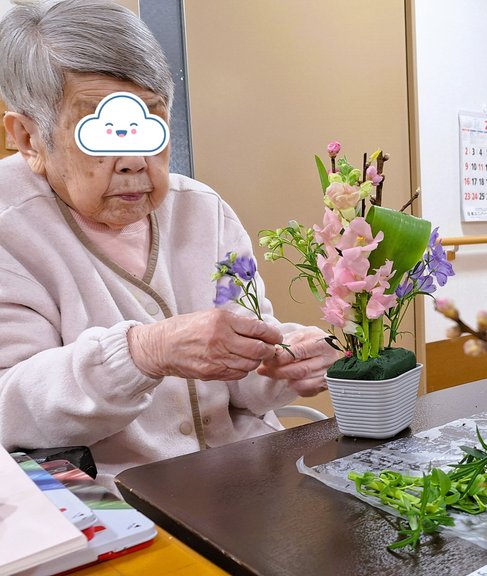 すいせん・あじさいユニットにてフラワーアレンジメントを行いました。事前に先生が茎を切って挿しやすいようにしてくださるので、自由に楽しんでいました。
