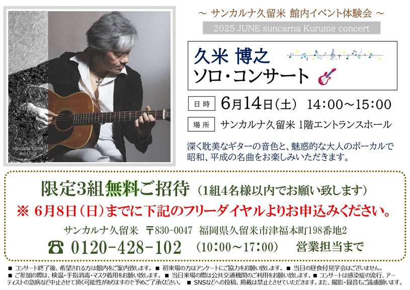 サンカルナ久留米では6/14に久光博之氏をお招きしての、ソロコンサートを開催いたします。