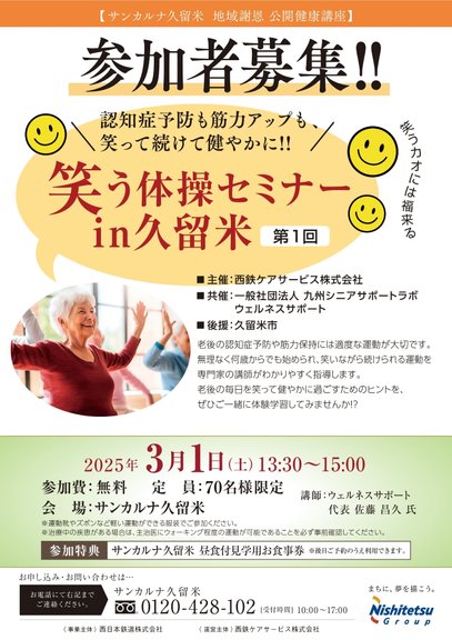 この度サンカルナ久留米では、ウェルネスサポート代表の佐藤昌久様を講師としてお招きし、認知症予防や筋力保持に役立つ「笑う体操セミナー」を開催いたします!