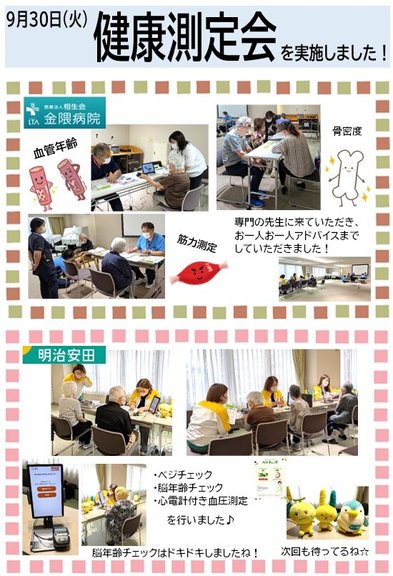 入居者の皆様の健康維持・促進にお役立ていただけるよう、金隈病院様と明治安田様ご協力のもと、6種類の測定会を行いました。