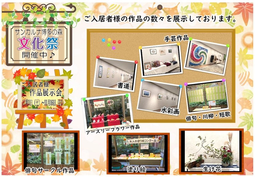 文化祭シーズンを迎えたサンカルナ博多の森では、書道や水彩画・俳句・生け花・アースリーフラワー作品など、ご入居者様が実際に作成した作品の数々を展示しております。