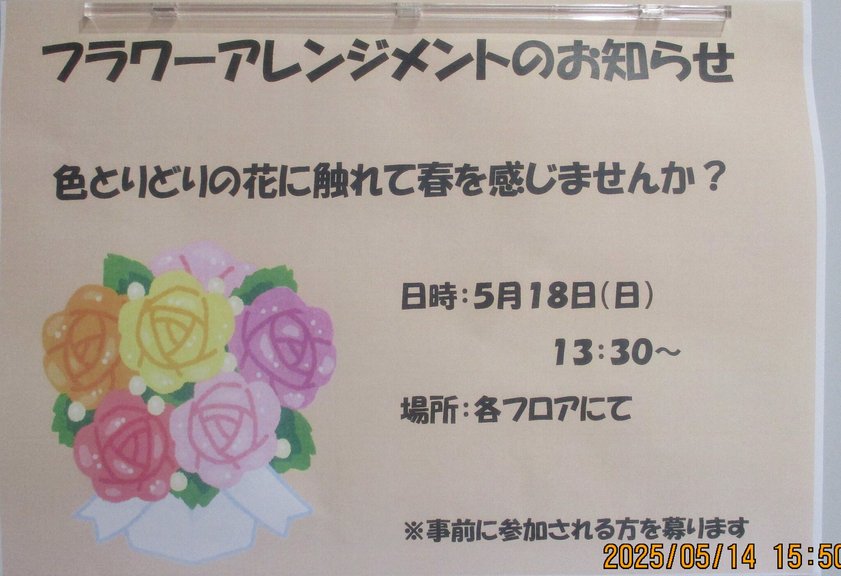 5月18日(日)にフラワーアレンジメントを予定しております。素敵なお花が生けられている様子が目に浮かびます。当日が楽しみです。