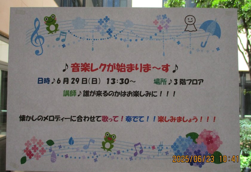 6月29日(日)に音楽レクリエーションを行います。懐かしのメロディーに合わせて楽しく歌いましょう。