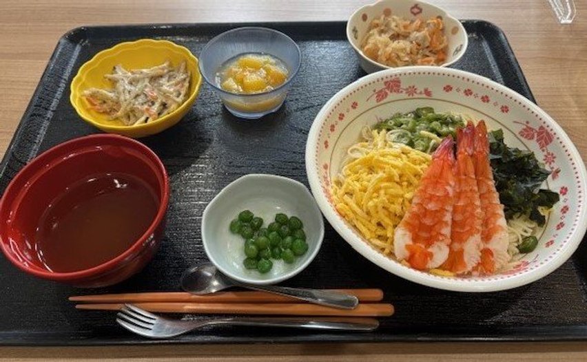 七夕でしたので「そうめん」をご提供しました。大きなエビがのっていて食べ応え満点です。デザートには涼し気な「桃のピーチジュレ」を召し上がっていただきました。「美味しい」と好評でした。