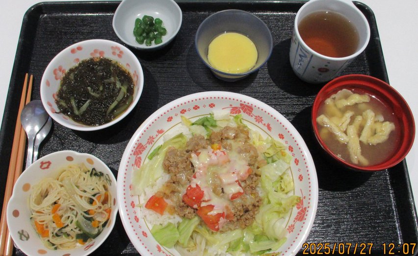 「タコライス」、「もずく酢」、「ソーミンチャンプル」や「イナムドゥチ」をご提供しました。聞き慣れない料理名もありますが、どの料理にも野菜がたくさん入っていて健康的なご飯でした。素麺が入った「ソーミンチャンプル」が食べやすくて美味しかったです。もちろん「タコライス」もレタスとチーズとひき肉のバランスが絶品で美味しかったです。