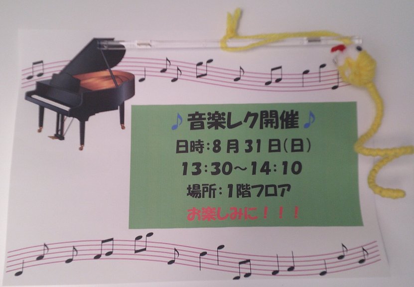 8月31日(日)13:30~音楽レクを行います。大きな声を出して暑さを吹き飛ばしましょう。当日が楽しみです。