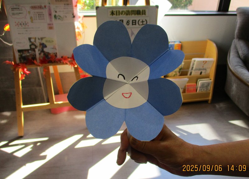 折り紙を重ねて折り、花の形になるように切り、中央に笑顔満点なお顔を書いたら出来上がりです。「可愛いね」と好評です。