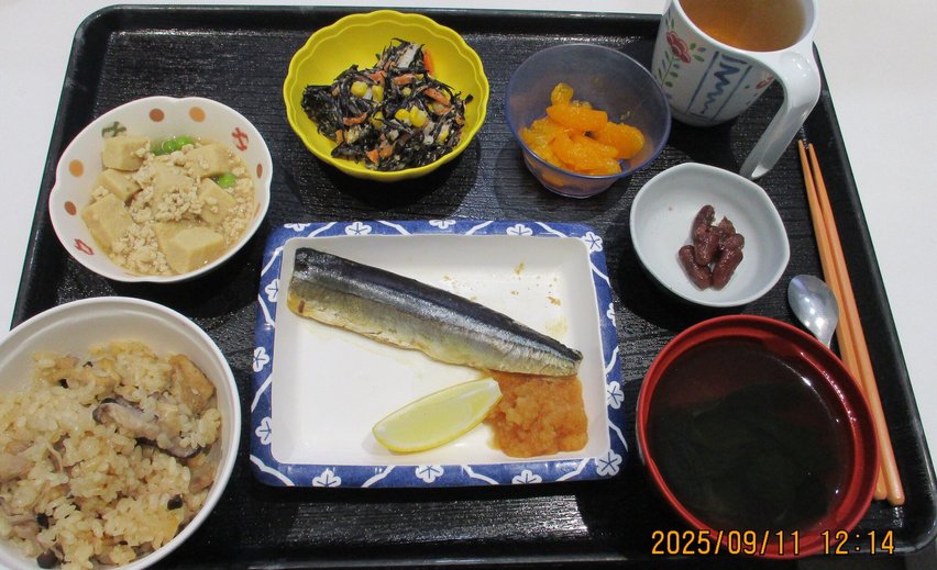 秋と言えば食欲の秋、秋の味覚と言えば秋刀魚。秋の味覚を味わっていただきたく「きのこご飯」や「秋刀魚の塩焼き」をご提供しました。秋刀魚は丁寧に骨抜きしているので、そのままパクリと美味しくいただきました。