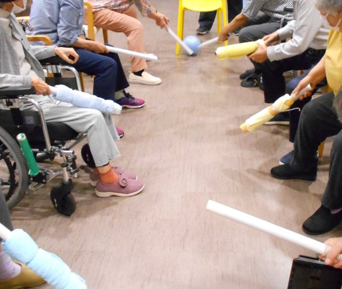 脚の代わりに棒を使って、相手ゴールにボールを入れるゲームです。「いつまでも青春」チーム対「今日も元気にかっ飛ばし隊」チームによる棒サッカーゲームが始まりました。司令塔が指示を出したり、棒と脚で器用に転がしたり、積極的に棒を動かしゴールへ。開始早々から白熱しています。
