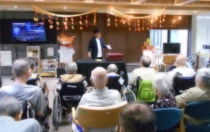 マジシャン天鳳(1040)さんによるマジックショーが開催されました。スプーン、トランプや新聞紙を使ったマジック、水を入れたコップを逆さにしても水が出てこないマジック等大変興味深いマジックが披露されております。不思議なマジックの世界に思わず身を乗り出して楽しまれていました。