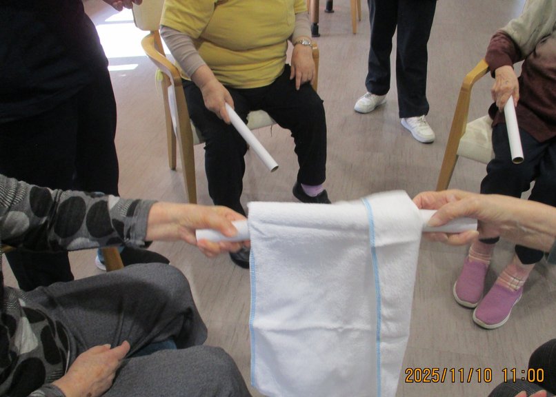 タオルを使用したレクを行いました。棒を使用してタオルを隣の方に渡したり、投げたタオルを棒でキャッチしたり、棒落としならぬタオル落とし等、アイデア満載のレクでした。「楽しかった」と好評です。