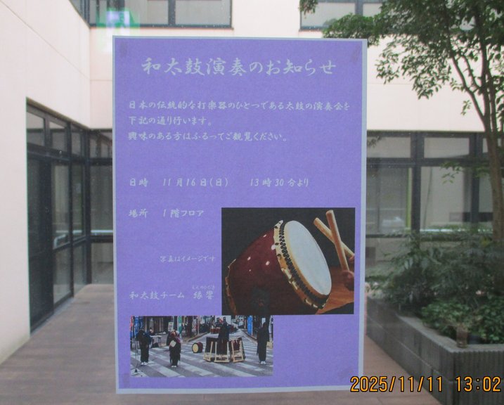 11月16日(日)に和太鼓演奏を行います。伝統的な打楽器のひとつである太鼓の演奏を是非お聞きください。