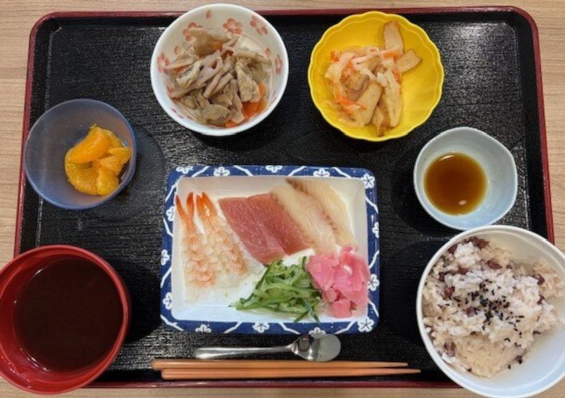 1月15日は「小正月」でした。「小正月」とは、1年の健康を願うこと、豊作を願うこと等の意味があるそうです。縁起の良い食材を使用し、赤飯、刺身盛り、れんこんと豚肉の煮物、大根と平天の香味サラダ、赤だしをご提供しました。小豆の朱色には邪気を払う力があると言われています。小豆を食べることで1年の無病息災を祈念しながら美味しくいただきました。