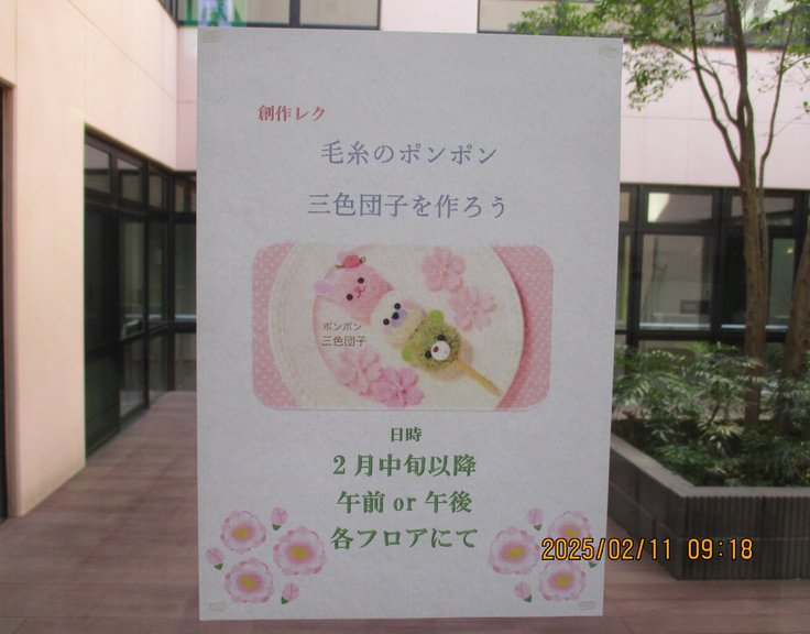 今月の中旬以降に、毛糸のポンポンで三色団子を作成する予定です。可愛らしい素敵な作品ができあがりそうです、完成が楽しみですね。