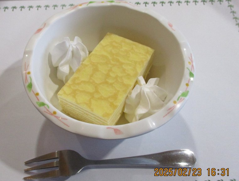 ミルクレープをご提供しました。入居者様から「7層だったよ」と生地と生クリームの層の数を教えて下さいました。丁度よい甘さの生クリームでしたので、男性の方からも好評でした。