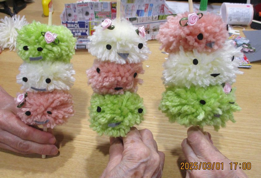 厚紙に毛糸を100回巻き、その後ハサミで毛糸が丸くなるように切ります。三色の異なる毛糸を棒に刺し、目や口を付けたら完成です。とても可愛らしい作品が出来上がりました。