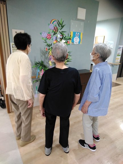 入居者様には早めに短冊をお配りし願い事を書いてもらい、スタッフと一緒に飾りつけをしました(*^-^*)