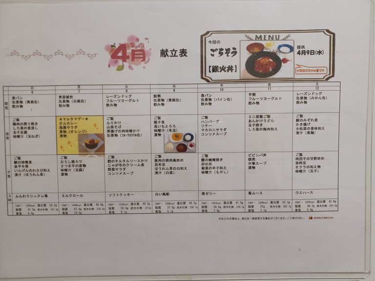 皆様こんにちは。今日は4月6から12日までの献立表をのせます。