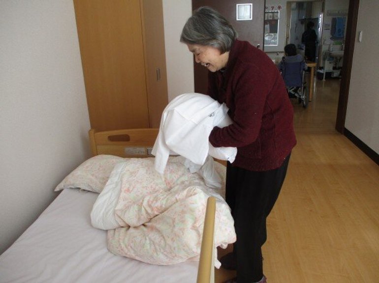 食器拭きやおぼん拭き、テーブル拭きやシーツ交換など、「どんどんやらせて!」「出来なくなっちゃうと困るから」「何十年もやってたんだもん、どうってことないよ~」と、ありがたいお言葉を毎日いただいています。