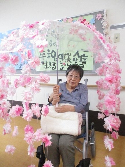 先月のブログに載せました、お花紙で作った桜を紐でつなげて、ビニール傘にくっ付けて……