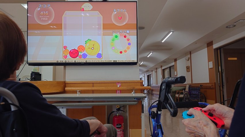 本日は、入居者の皆様と一緒にNintendo Switchを使って「スイカゲーム」に挑戦しました!