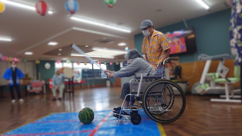 目隠しをして、皆さんの「右!右!」「そこ!今!」という声援の中でスイカをめがけて挑戦。