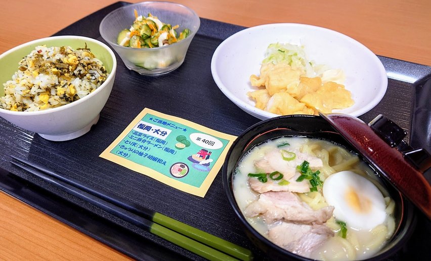 本日も、入居者の皆様に少しでも旅気分を味わっていただけるよう、福岡県・大分県のご当地メニューをテーマにした昼食をご提供いたしました。