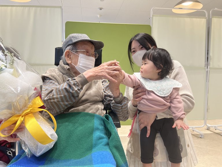 100歳のご入居者様からしたら、ひ孫ならぬ玄孫からのサプライズプレゼントに、うっすらと涙まじみりの、満面の笑みで園児の手を取り心から喜んでおられ、『0歳から100歳まで一生涯の学びを提供』するべく取り組みを行っているGakken多世代スクエア吹田SSTを象徴する、本当に貴重な瞬間となりました。