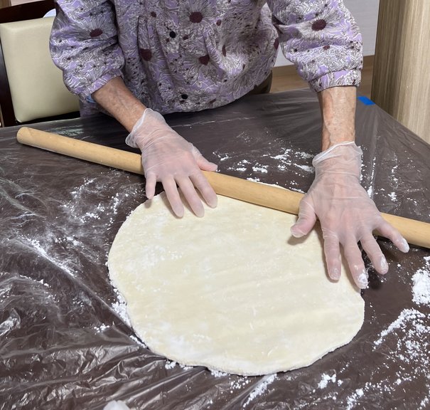 入居者の皆様に調理を楽しんでいただこうと、手打ちうどんを作りました。