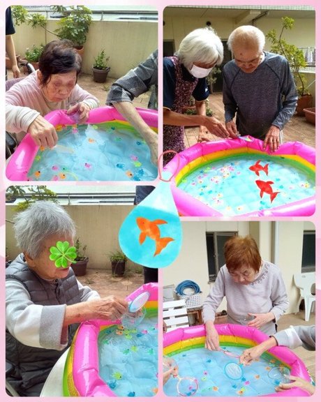 フロア内からテラスに移動し金魚すくいへ