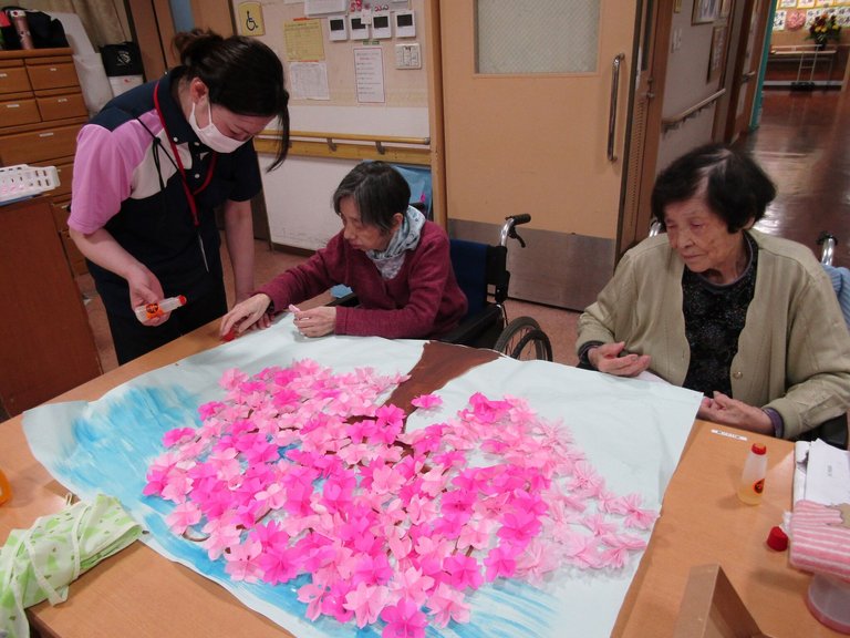 写真は食堂にて、職員のHさんも手伝いながら制作する、ご入居者様のI様とS様。こちらも満開に仕上がりそうです❀