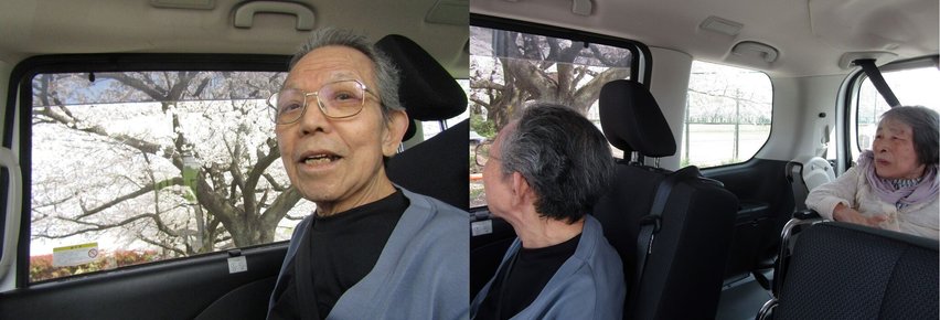 お写真は車内からお花見される、ご入居者様のK様とH様。K様が仰るには、「以前、ここに来た事がある」との事。今年も見られてご満悦の様子。