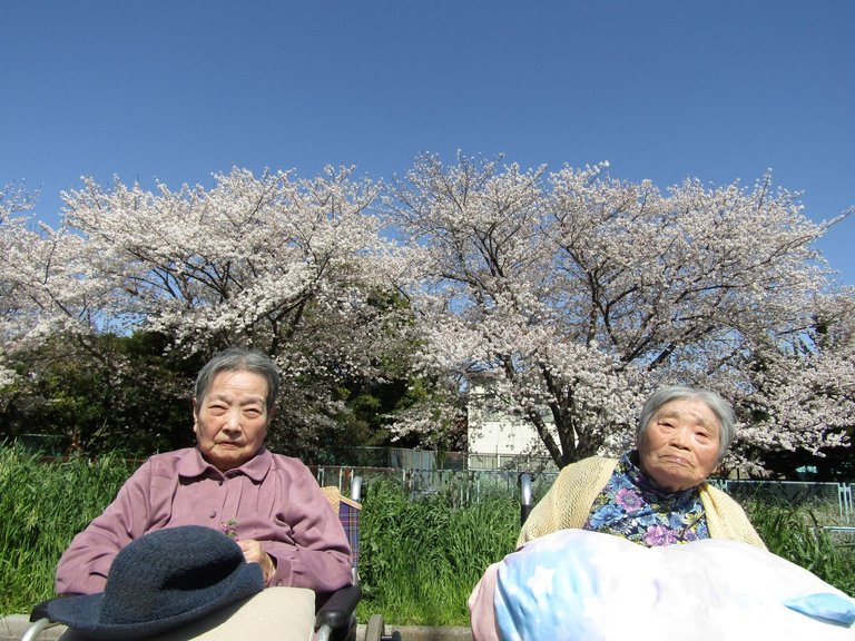 お写真は、桜の木を背景に写る、ご入居者様のO様とY様。