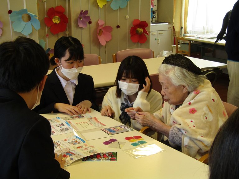 写真は実習生から手ほどきを受けながら作る、ご入居者様のH様。