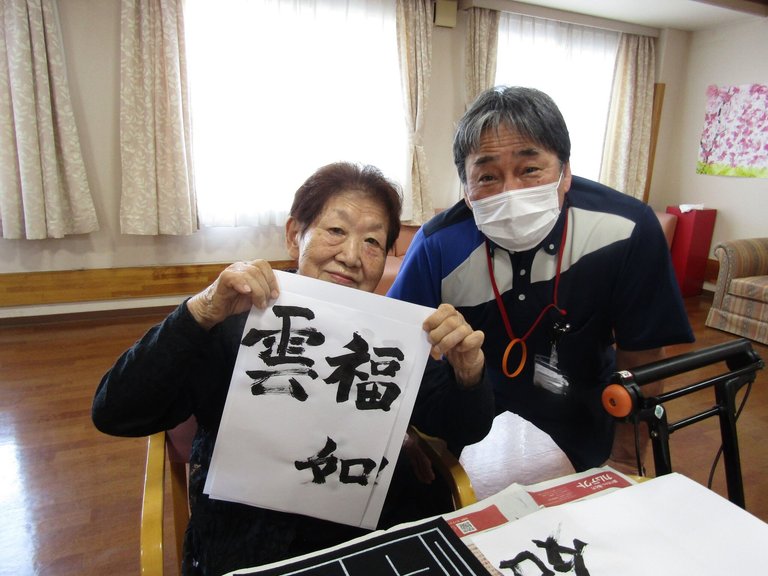 お写真は、書を手に持ち写る、ご入居者様のW様と、このたび5月から就任しましたT施設長。