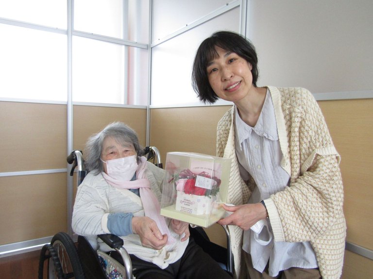 お写真はご入居者様のH様とご家族様。H様は、ご夫婦で当施設へご入居されています。今回は奥さまに、母の日のプレゼント♡