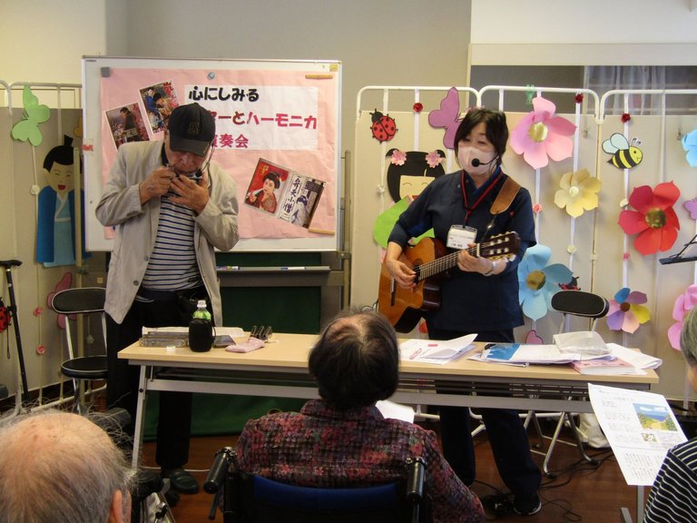 施設では先日、ハーモニカ源さんをお招きして、S看護師とのギターセッションを行いました。