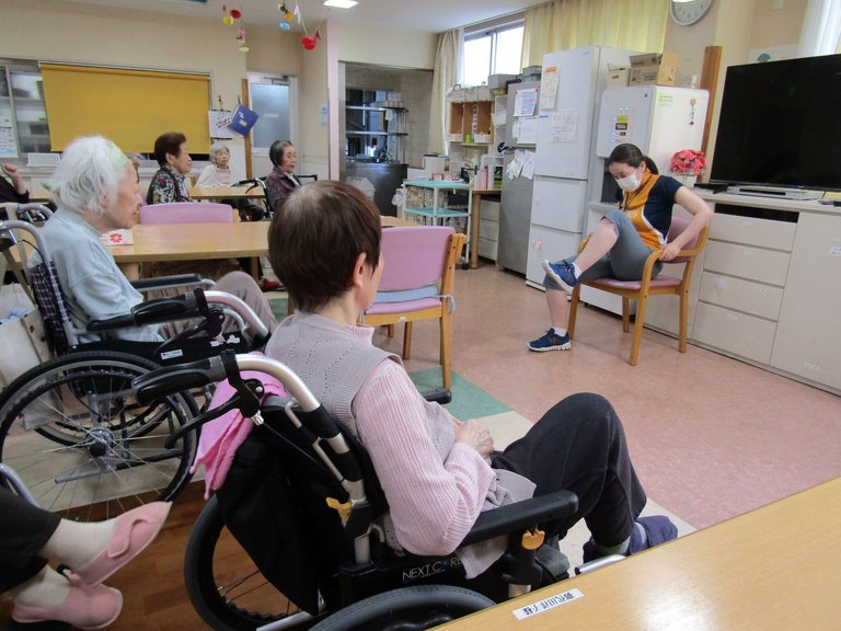 元気な東浦和のご入居者様。先生の運動を見て、筋トレ中‼