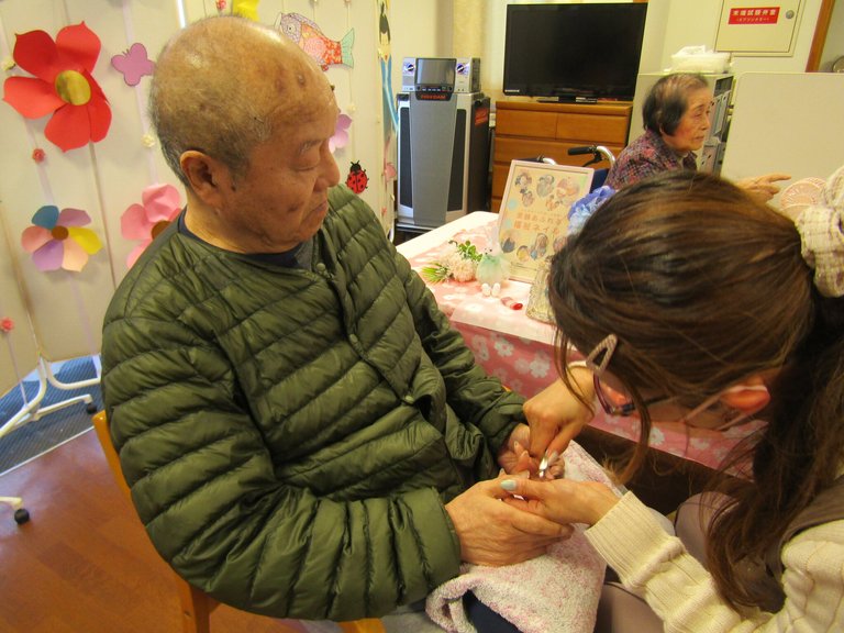 お写真はご入居者様のY様。男性もネイルありです‼爪と甘皮のお手入れを施術中‼キレイは見た目も健康にも効果あり❢