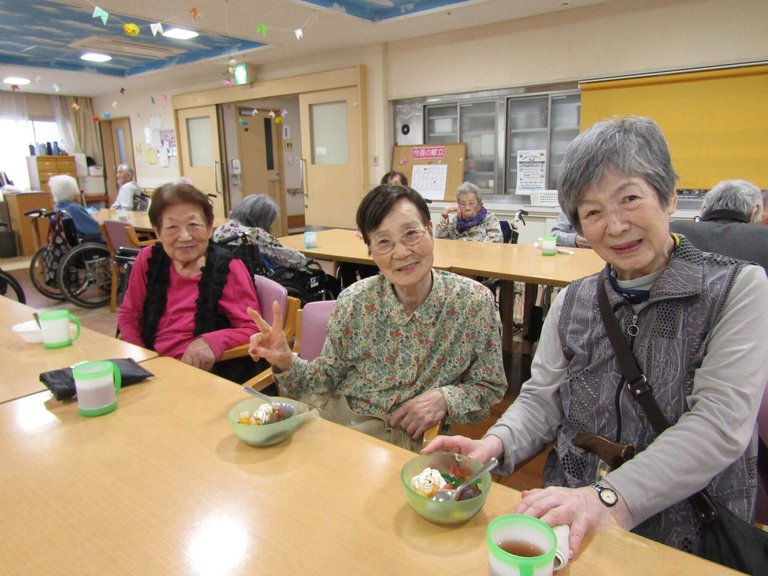 お写真は、ご入居者様のW様、M様、M様。あんみつ姫、ならぬ、あんみつ三姉妹⁈
