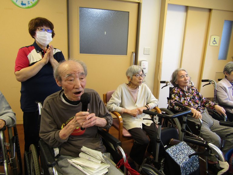 施設では、6月のカラオケを行いました。月イチ(1回)のカラオケ。