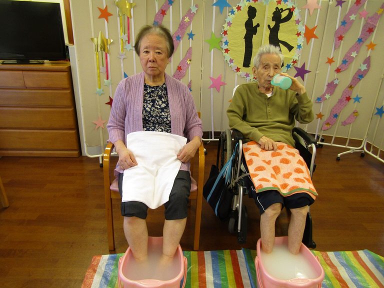 お写真はご入居者様のY様とN様。なんだか、表情が硬いというか、険しい。。N様、コップを持ち、水分補給中、、たまたまの写真写りと、致しましょう!
