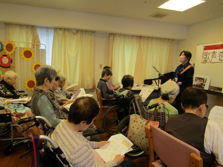 施設では、歌声喫茶がございました。今回は、歌声の部をご紹介☆