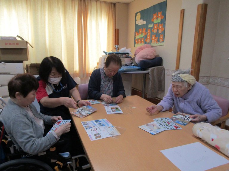 写真は、食堂にて参加されるご入居者様。話すことなく、黙々と取り組んでいます。。